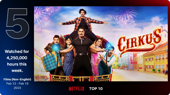 4,250,000시간 시청으로 5위를 차지한 서커스는 인도 영화이며 국가 제한이 있어 정보가 누락되었습니다.