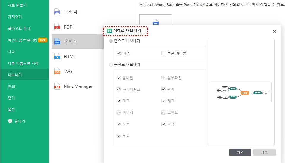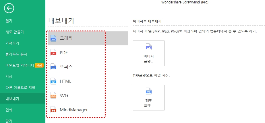 완성된 마인드 맵은 그래픽, PDF, 오피스, HTML, SVG 등 다양한 포맷으로 내보낼 수 있는 것도 장점입니다.