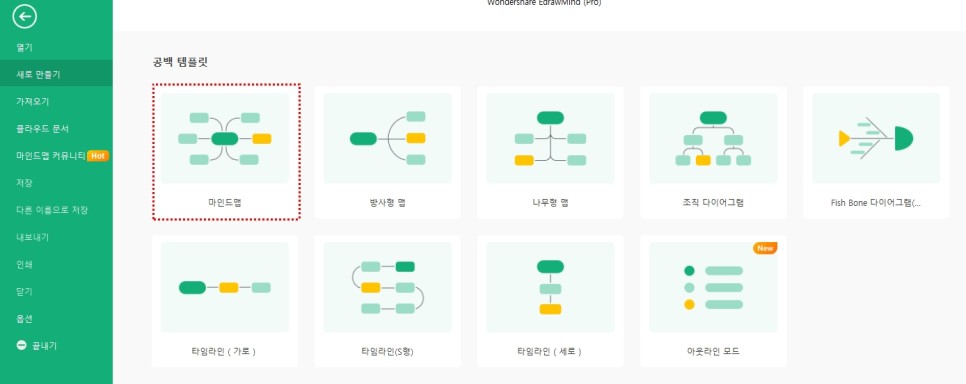 위의 이미지를 보시면 다양한 마인드 맵 템플릿이 내장되어 있는 모습을 보실 수 있습니다. 마인드 맵 그리기 프로그램인데, 사실상 모두 그려진 배경에 글자를 입력하기만 하면 쉽게 완성됩니다.