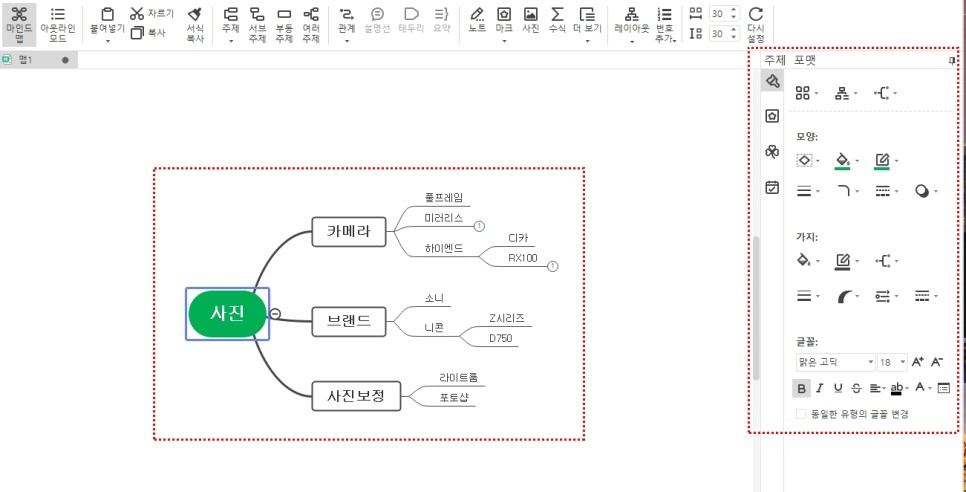 중앙에 가져온 마인드 맵을 기반으로 상단, 우측 영역에 있는 툴을 이용하여 적절히 수정해 나가면서 완성할 수 있습니다.