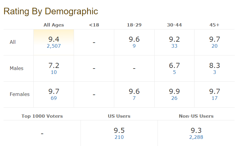 전 세계 콘텐츠 등급을 볼 수 있는 IMDB 사이트에서 등급은 9.7에서 시작해 3월 5일 현재 9.4를 기록하고 있다.