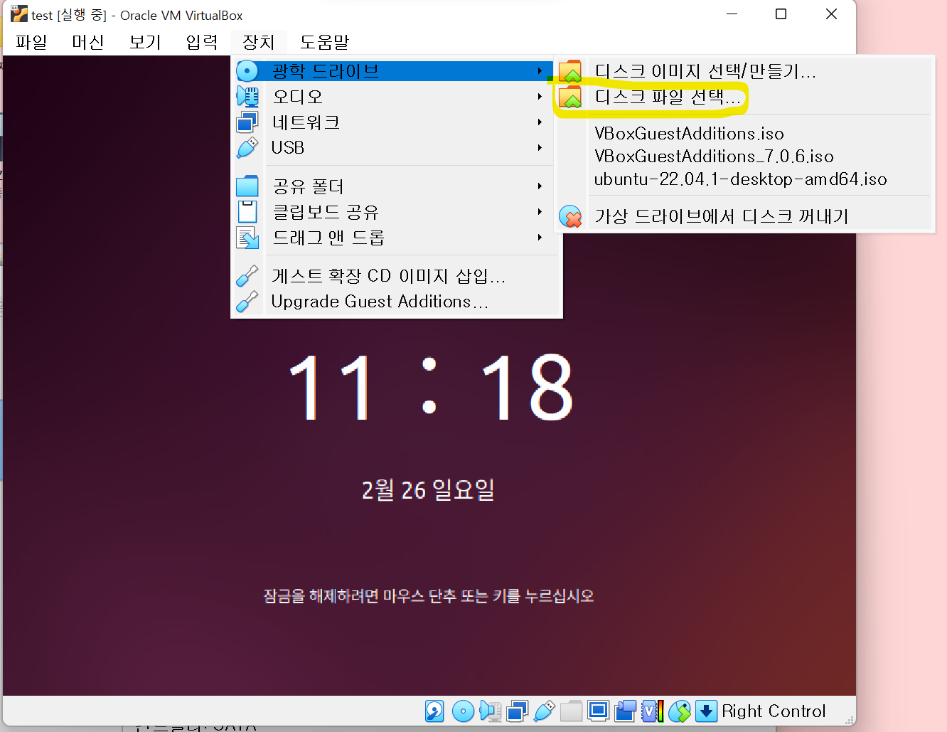 맨 위 (장치) – (게스트 추가 CD 이미지 삽입) 설치하려면 클릭하세요. 이 버튼을 누르면 인스톨러 팝업이 뜬다고 하는데 계속 눌렀다가 광디스크를 꺼내고 다시 눌렀는데 아무런 반응이 없습니다.
