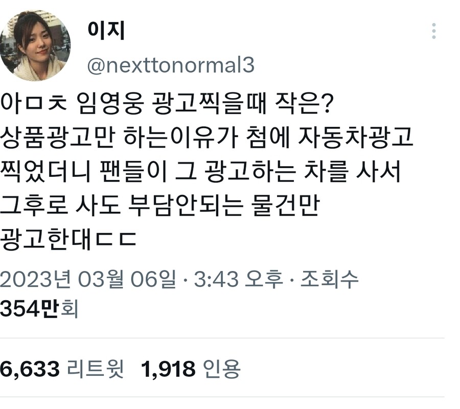 임영웅이 스케일 작은 광고만 찍는 2023년 03월 09일 by issue 자동차 광고를 찍었습니다.팬들은 차를 삼킨다??? : 임영웅 자동차 광고 연출우리 차를 바꿀 때인가요? '추천 관련글, 자동차 세금표가 이렇게 유용합니다.(자동차 배기량 세금, 자동차 세금 환급 조회 방법)차량 비교 사이트 자동차보험료비교견적사이트 확실하게무료 충전은 성남시청 타이어 공기압 주입기로! 성남 분당자동차 타이어 공기압축구 리뷰 한국 vs. 콜롬비아 (03/23/24) // 국가대표 현장에서의 직감은 사라져야…