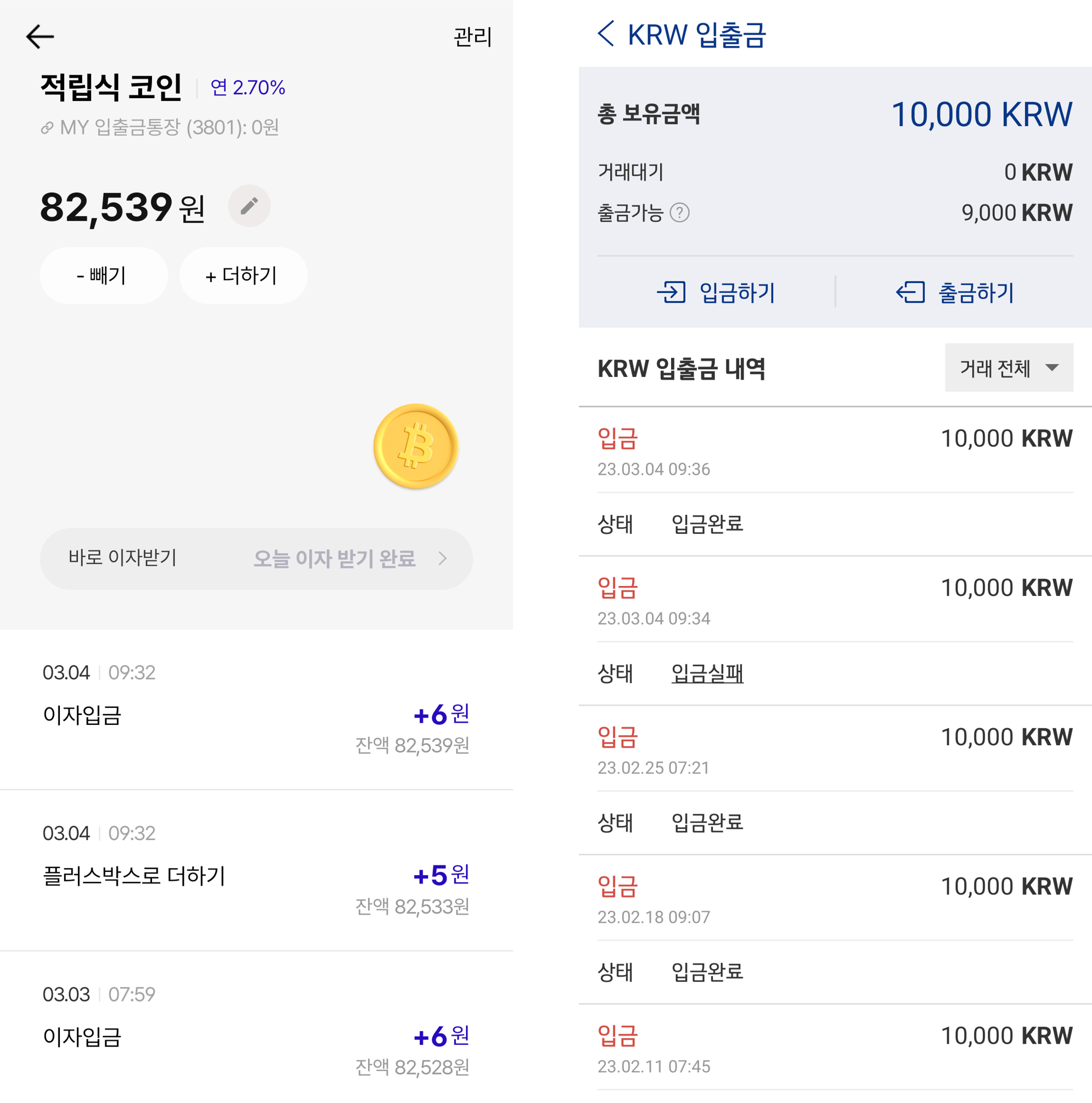 업비트 케이뱅크 82,539원에서 10,000원 입금,