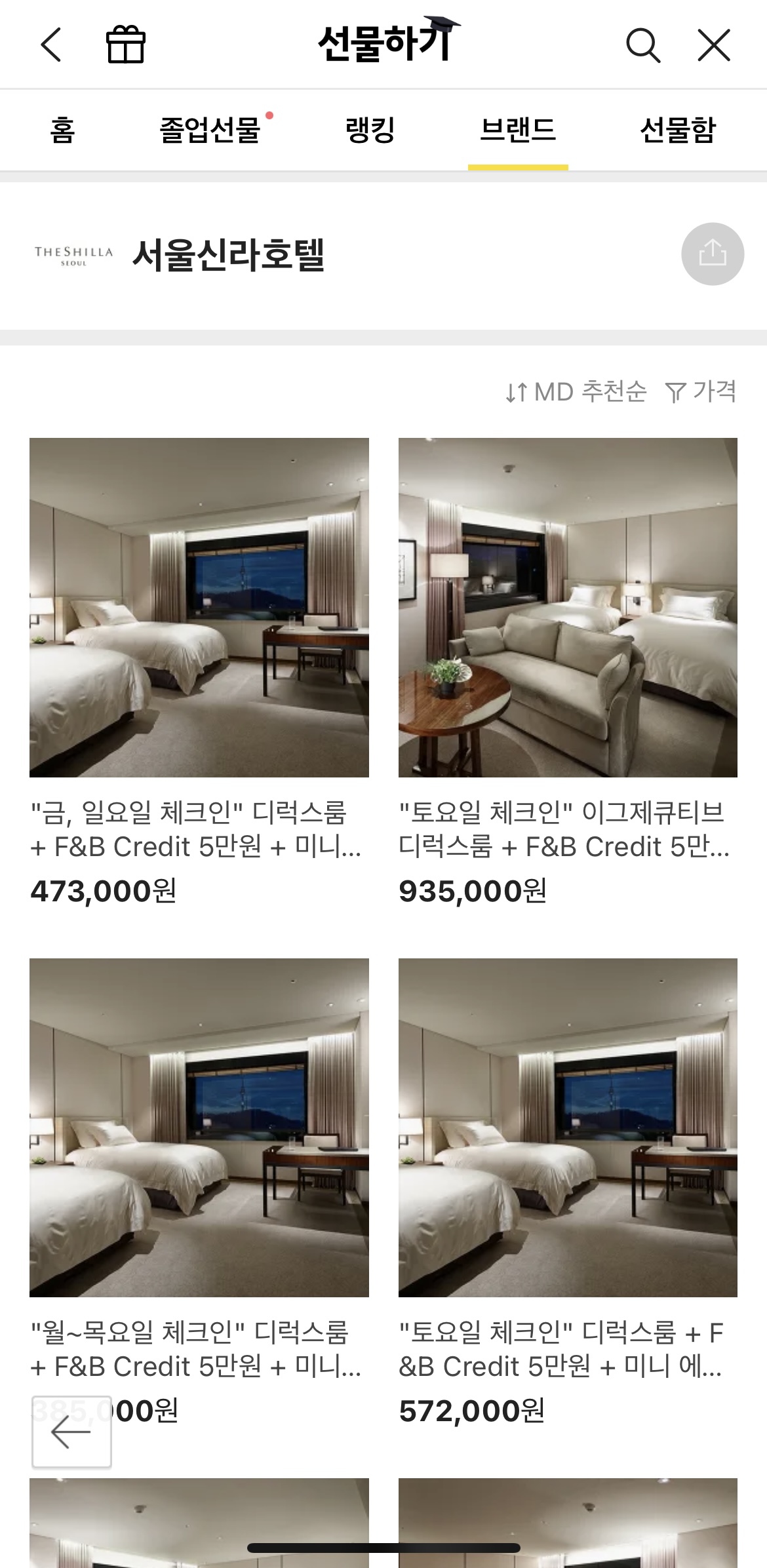 카카오톡 선물하기 연동 후 브랜드 탭 > 모바일 바우처 > 호텔 예약누르다 .