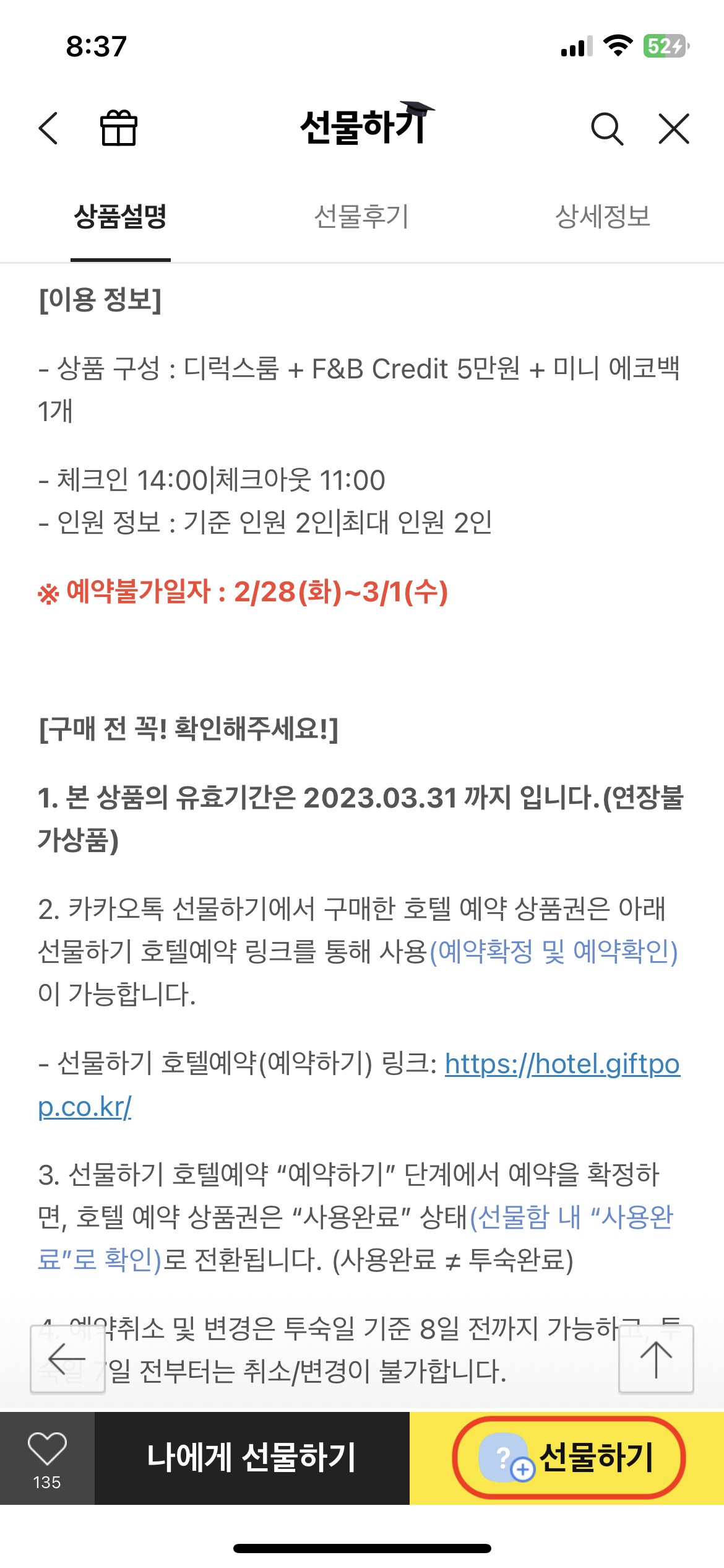 예전에는 호텔 숙박권을 선물하기 위해 일정과 객실을 확인해야 했지만, 앞으로는 선물 받는 사람이 원하는 일정을 선택할 수 있어 모바일 카카오톡 숙박권을 이용하는 것이 편리할 것이다.
