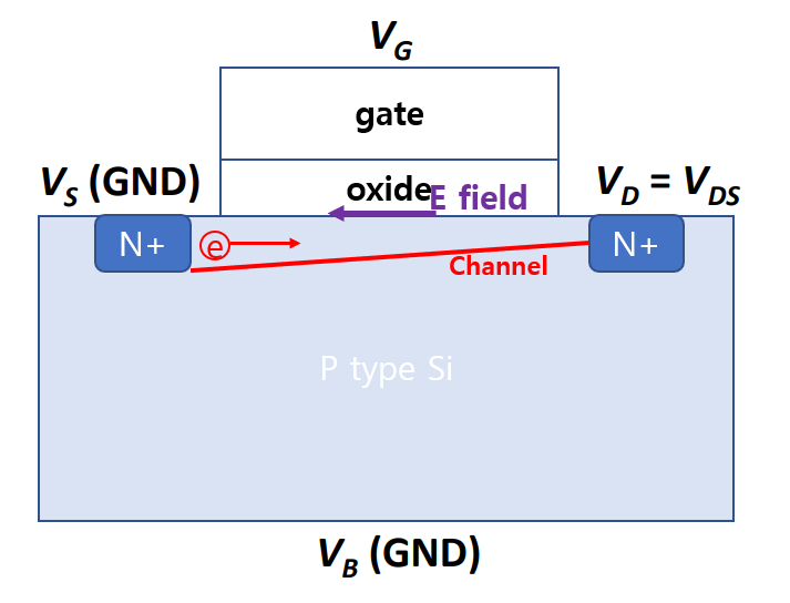 Vds가 적용된 경우를 살펴보자. (이 시점에서 게이트 전압은 항상 일정하다고 가정합니다.)
