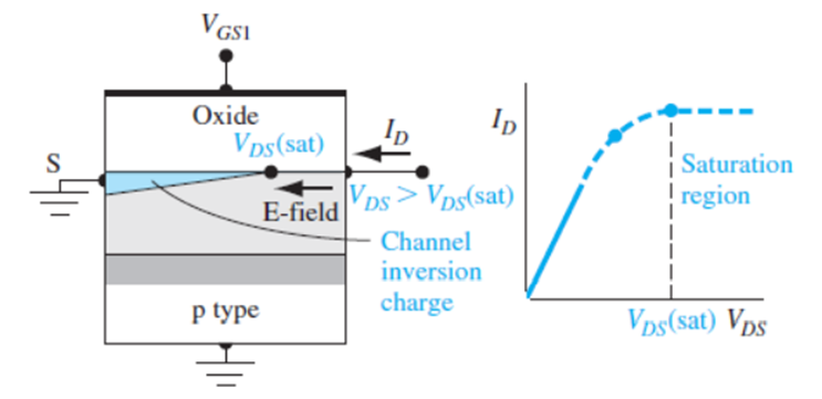 따라서 채널을 흐르는 전자의 양은 $V_{G}$에 의해 결정되므로 $V_{D}$가 증가하더라도 드레인 전류는 일정하게 흐른다.