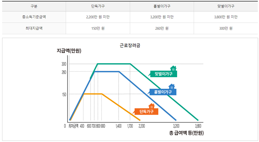 근로장려금의 수준은 가구원의 구성에 따라 결정되는 부부의 급여총액을 합산하여 산정한다.