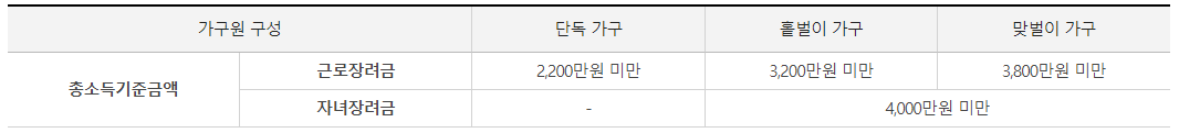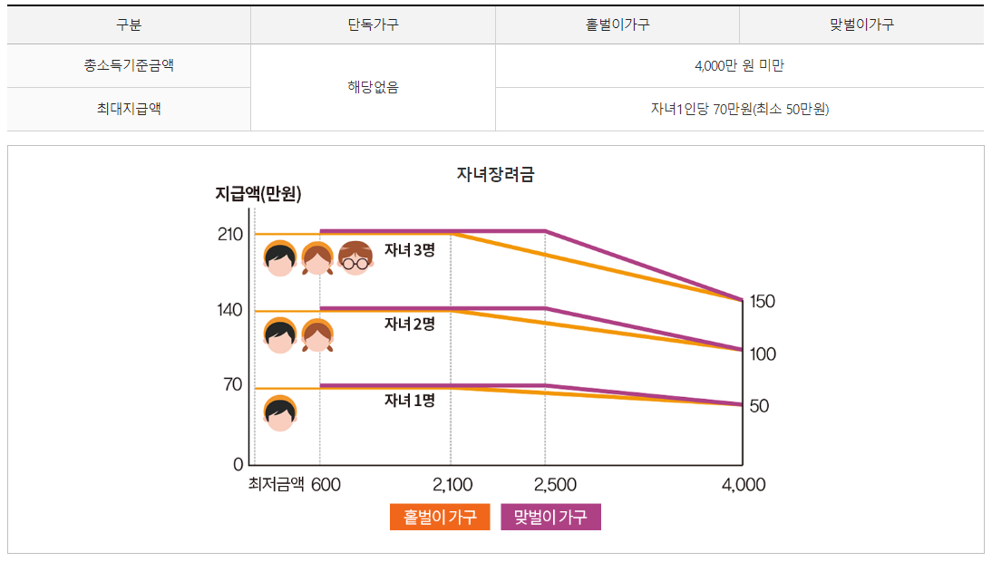 저소득층 자녀양육을 지원하기 위해 합산 소득(부부) 4000만원 미만과 부양자녀(18세 미만) 1인당 최대 70만원(최소 50만원)을 지급한다. 자격 요건은 근로 인센티브와 동일합니다.